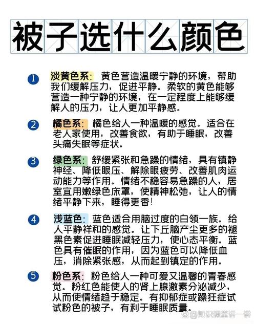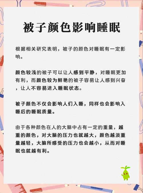 〖One〗、颜色与情绪的影响 首先,我们要明白,被子的颜色确实会影响我们的睡眠。暖色调如橘色、黄色等,给人一种温暖和安全的感觉,有助于放松身心,进而促进良好的睡眠。而冷色调如蓝色、紫色等,可能会使人产生寒冷和不安全的感觉,不利于安稳入睡。