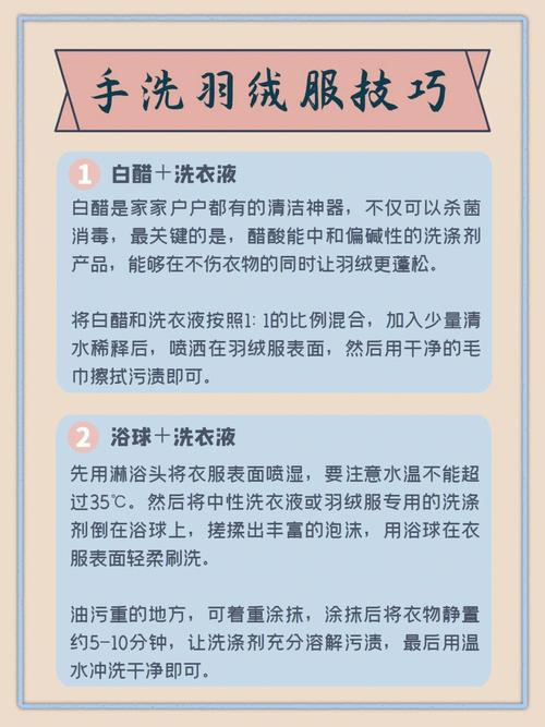 〖One〗、总结 综上所述,为了保持羽绒服的保暖性能和延长使用寿命,建议一冬清洗两次为宜。同时,在日常穿着过程中,注意保持羽绒服的清洁,避免沾染过多污渍,以减少清洗次数。对于不可避免的污渍,可采用局部清洁的方法进行处理。