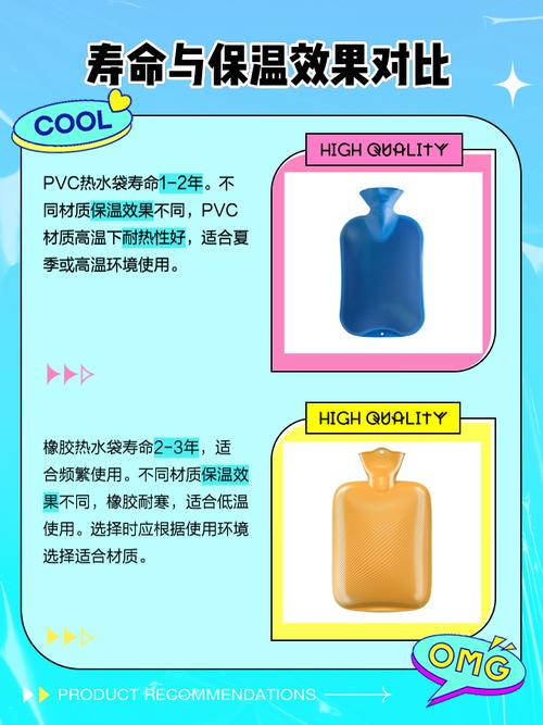 〖Five〗、PVC材质和橡胶热水袋各有特点。PVC材质的热水袋可能强度较低,易受挤压导致爆炸或漏水,但医疗级PVC材质的产品标准较高。橡胶热水袋则具有更好的耐热性,但可能存在异味较重的问题,因此不建议给儿童使用。