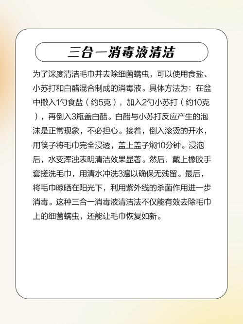 理解了发粘的原理后,下面几种方法可按需选取: 方法1:热水+食盐搓洗 烧一壶70℃以上的热水,加入3『5』勺食盐融化后浸泡毛巾20分钟,此时水温足以杀灭大部分细菌,而盐的颗粒感在搓揉时能带走纤维深处的污垢。搓洗后再用正常洗衣流程清洗一遍即可。