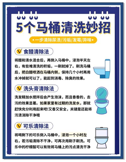 去除马桶异味的方法主要有以下几种:使用花露水、食用碱和清水混合液:在一个干净的塑料瓶中,倒入适量的花露水、食用碱和清水,混合均匀。在塑料瓶底部扎几个小洞,以便液体能够均匀喷洒。打开马桶盖,用力挤压塑料瓶,将混合液喷洒在污垢处。使用毛刷反复清洗,这样可以有效去除马桶内的异味。使用可乐清除异味:将适量的可乐倒入马桶中。