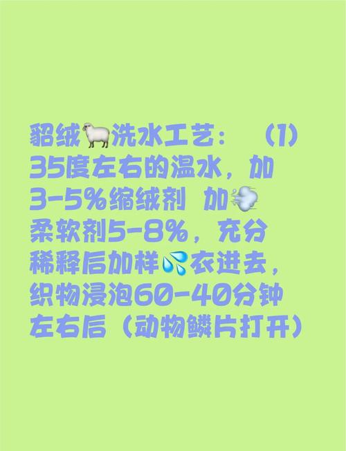清洗方式:手洗:水貂绒毛衣可以手洗。在清洗前,先检查衣物是否有破损或脱线的情况。干洗:如果不方便手洗,也可以选取干洗。不可机洗:切记不要使用洗衣机清洗,以免损坏衣物纤维。手洗步骤:浸泡:将水貂绒毛衣放入冷水中浸泡1020分钟,注意水温不要过高,以免缩水或变形。