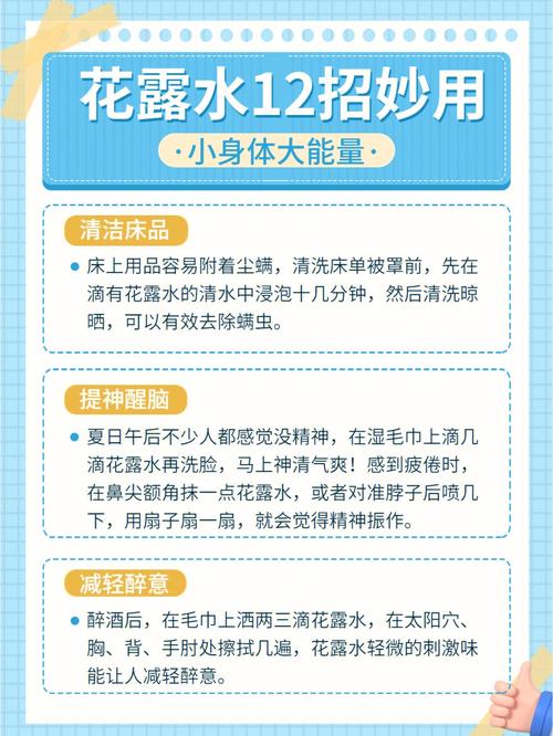 综上所述,花露水不仅具有驱蚊功效,还有许多隐藏的妙用,如作为空气清新剂、垃圾桶除臭剂、自制驱蚊手环、衣服除汗臭味剂、去除外卖和快递信息以及水雾风扇平替等。这些妙用不仅实用,还能让我们的生活更加便捷和舒适。