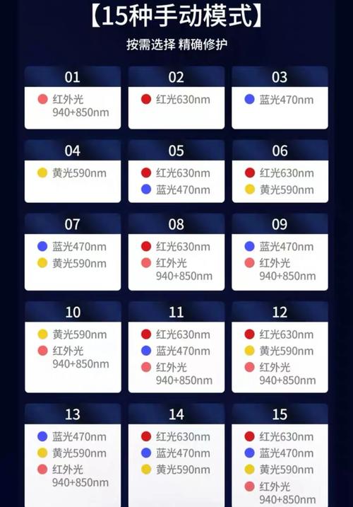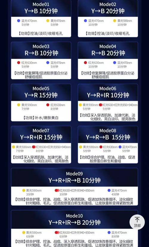 模式六(红色LED+黄色LED):结合红光和黄光功效,达到抗衰老、祛斑、祛痘印的综合效果。模式七(三色光混合彩光):多种彩光同时照射,解决多种肌肤问题,效果加倍,适合忙碌但追求高效护肤的使用者。此外,belulu大排灯还配备有上下键用于调整使用时长,以及AB键代表不同的预设模式组合。使用过程中需佩戴眼镜以保护双眼。