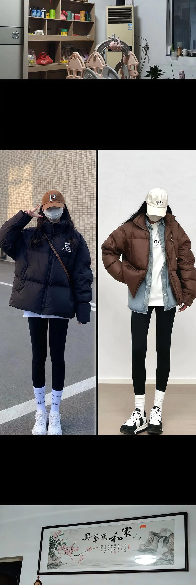 〖Two〗、这套冬季穿搭以黑色短款棉服为主,内搭白色加绒卫衣,下穿黑色鲨鱼裤和大白袜搭配白色老爹鞋。外套的黑色棉服带有经典的两道杠设计,内搭的白色卫衣加绒保暖,下装的黑色鲨鱼裤内置加绒材质,既能收腰提臀又展现腿部线条,搭配大白袜和白色老爹鞋,增添了几分俏皮感。
