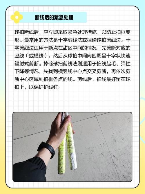 羽毛球线断了应及时更换新线。以下是关于羽毛球线断了后如何处理的具体建议:不可尝试补线 避免拍子变形:羽毛球线的断裂往往是由于长时间的使用或不当的击球方式导致的。一旦线断了,很多初学者可能会想尝试补线,但这是不可取的。因为补线会导致拍子上的线张力不均匀,进而使拍子变形。