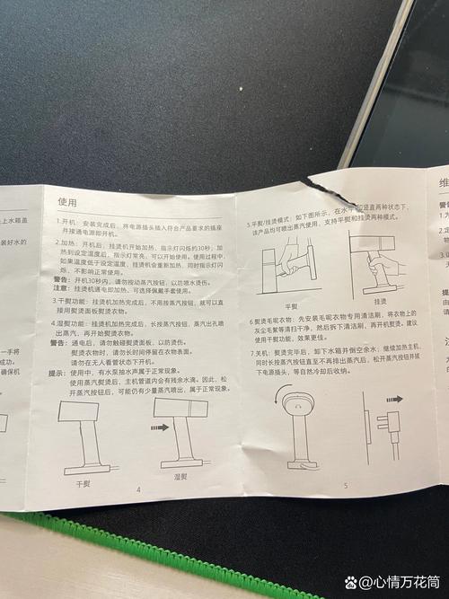 使用注意事项 在家中烫裤子的时候,可用平滑的金属喷头,将其表面压平整,实现压烫平整的效果。当使用的时候的出现气量小,水垢堵塞住出气口的现象,可以用白醋与水1∶1 混合后,从进水处灌入反复摇晃,然后把蒸汽挂烫机底部的除垢阀门打开,将里边的水倒出来。