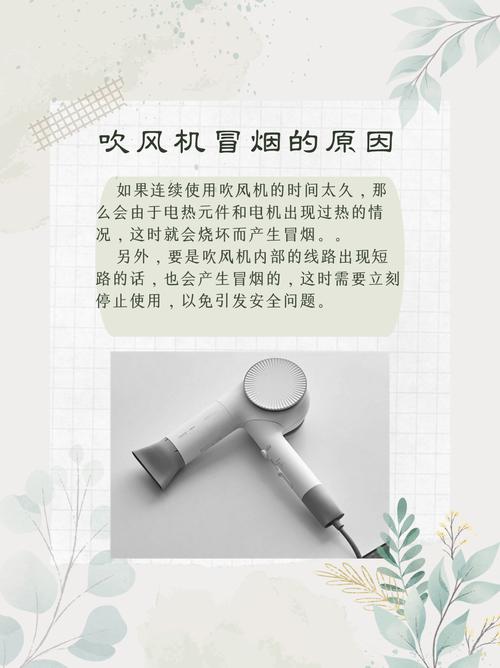 〖One〗、吹风机首次使用冒烟的原因 当您首次使用吹风机时,发现其冒烟,这主要是因为吹风机内部的加热丝以及其他元器件表面的物质在遇热后产生的烟雾。这种情况在电器的初次使用中较为常见。遇到这种情况,用户不必过于担心,因为这是正常的现象。