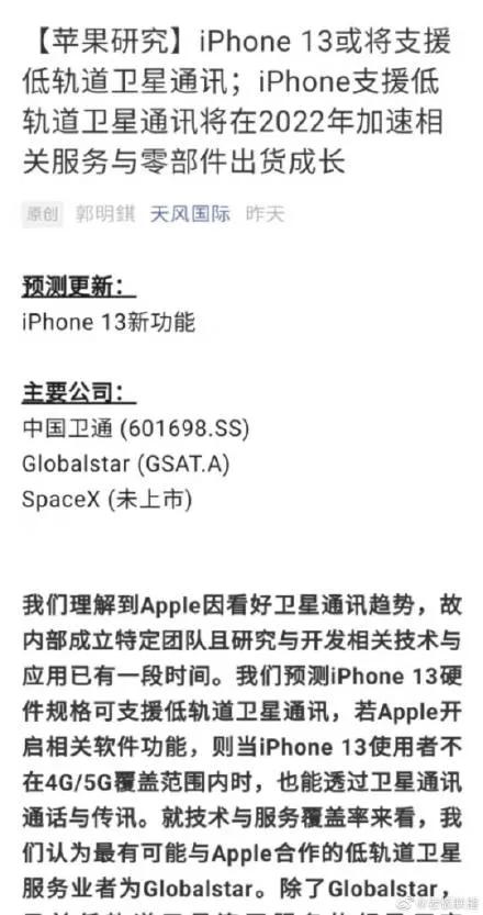 郭明錤表示,iPhone13系列将配备能够连接到LEO卫星的硬件,配合相关的软件功能,可让iPhone13用户在没有4G或5G移动网络的情况下拨打电话和发送消息。据报道,iPhone13采用定制的高通X60基带,支持卫星通信。而其他手机品牌想要实现类似卫星通话功能,基本需要等2022年才全面上市的X65基带。