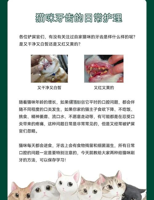 〖One〗、给猫咪清洁口腔,可以采取以下几种方法:使用猫咪专用漱口水:将漱口水按照比例加入猫咪日常的饮水中,让猫咪在饮水的过程中自然清洁口腔。使用口气清新剂:在猫咪摄入软性食物后,将口气清新剂喷在猫咪的口腔内,有助于去除口腔异味和细菌。使用牙膏和牙刷:准备软毛牙刷:选取刷头柔软的牙刷,以避免对猫咪的牙龈造成伤害。