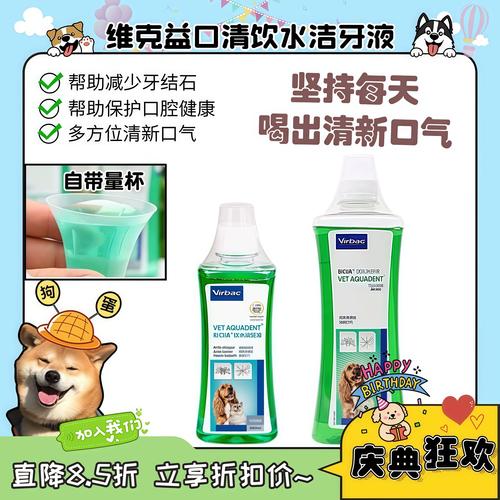 适用:猫狗通用,适合日常清洁,减少口臭和牙垢。注意:部分猫可能对味道敏感,初次需少量尝试。 维克(Virbac)CET宠物漱口水 特点:含洗必泰(Chlorhexidine),抗菌效果强,适合已有牙周问题的宠物。适用:需兽医建议使用,尤其推荐给有牙龈炎的狗狗。