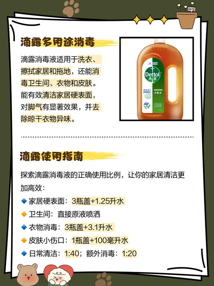 〖Four〗、滴露消毒液可以用于拖地,它能够有效除菌消毒。但在使用时,必须按照正确比例稀释滴露消毒液。如果不进行稀释或浓度过高,可能会损坏地板,因为滴露消毒液具有一定的腐蚀性。滴露消毒液使用注意事项: 皮肤清洁消毒:在使用滴露消毒液清洁皮肤时,注意控制用量和稀释度。