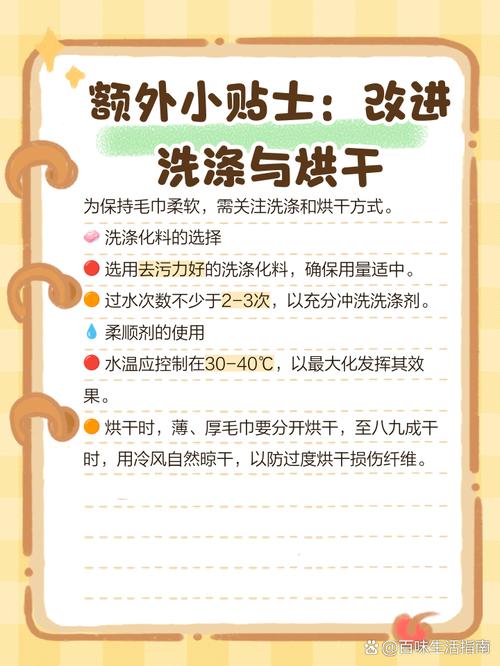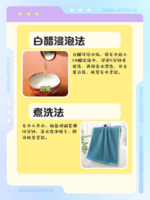 白醋浸泡:用1份白醋与4份清水混合,将发硬毛巾浸泡约30分钟,醋酸能溶解水垢和皂垢。浸泡后用清水彻底漂洗。此方法适合因水质过硬导致的发硬,对棉质毛巾效果好,丝绸或羊毛材质慎用。小苏打清洗:在温水中加入两勺小苏打,放入毛巾浸泡1小时后正常搓洗。