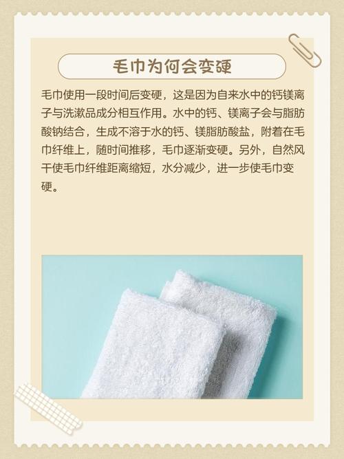 毛巾变硬的原因 水中矿物质沉积:毛巾在反复使用过程中,会与含有钙、镁等矿物质的水接触,这些矿物质会在毛巾纤维上沉积,形成难以去除的硬垢,导致毛巾变硬。油脂和污垢积累:毛巾在使用过程中会吸附皮肤上的油脂、污垢以及洗涤剂残留,这些物质在毛巾纤维上积累,也会使毛巾变得粗糙和硬化。