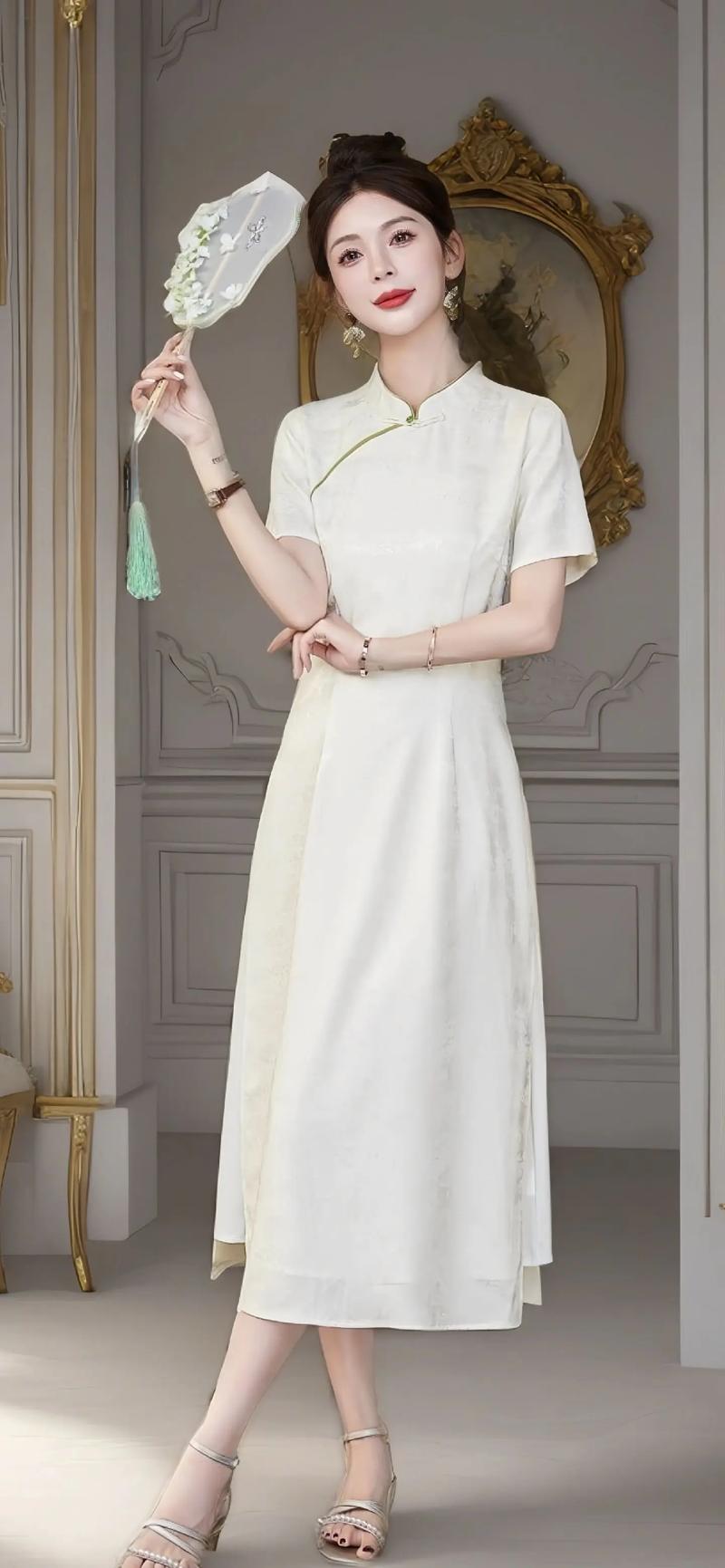 〖Four〗、浅色高跟鞋(经典优雅)裸色/米色/银色高跟鞋:视觉延伸腿长,简约大气,适合正式场合(如婚礼、晚宴)。珍珠/缎面装饰:增添复古感,与旗袍的东方韵味呼应。 尖头单鞋(精致复古)白色/杏色尖头平底/低跟鞋:舒适又显气质,适合日常穿搭或约会。