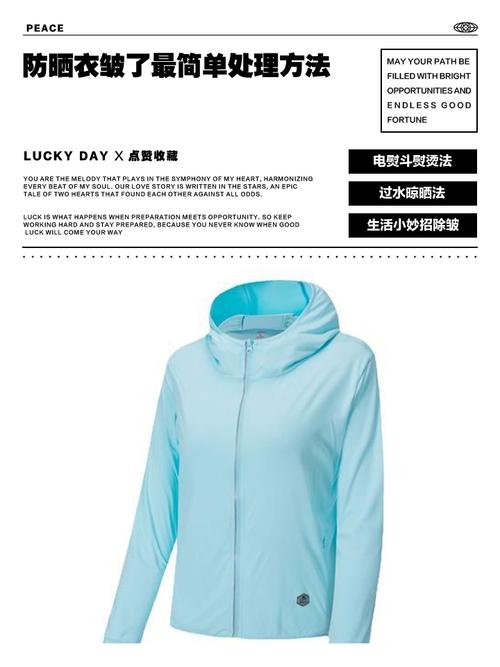 〖Two〗、清水拍打或抖动法 这是最简单直接的方法。在防晒衣的褶皱处轻轻撒一些清水,注意水量不要过多,以免衣服过于潮湿。然后用手轻轻拍打或抖动衣服,使褶皱逐渐展开。这种方法适用于快速去除轻微褶皱,但需要一定的耐心和力气。喷水晾晒法 准备喷瓶:准备一个喷瓶,装入适量的清水。
