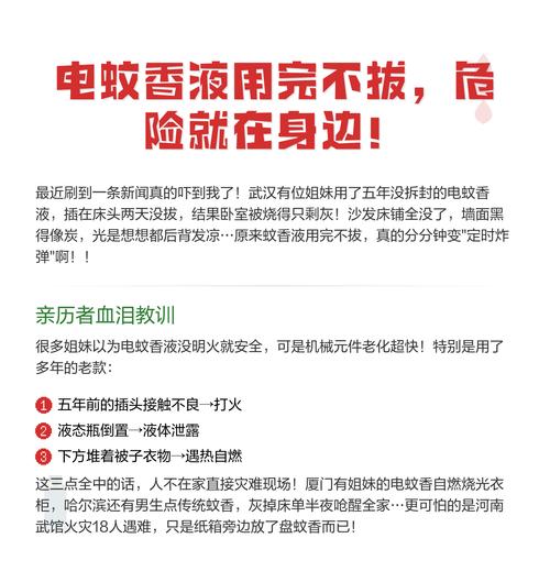 〖Five〗、很多人依赖电蚊香来驱蚊,那么电蚊香使用一天一夜会有什么后果吗?电蚊香长时间插着会有火灾风险吗?我们来详细探讨一下。首先,偶尔将电蚊香插一天一夜通常不会造成问题。尽管电蚊香液能迅速溶解在空气中,但长时间停留在充满电蚊香的房间仍可能引发不适。因此,不建议频繁长时间使用电蚊香。