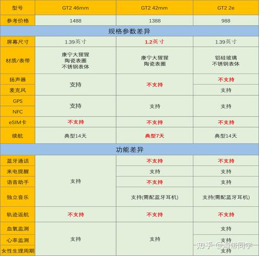 〖Four〗、GT2和GT2e的主要区别如下:屏幕材质 GT2e的屏幕材质为铝硅玻璃。这种材质在保证屏幕强度的同时,也提供了相对较轻的重量。GT2 46mm的屏幕则采用了康宁大猩猩玻璃。这种材质以其出色的抗刮擦和抗冲击性能而著称,为用户提供了更加耐用和清晰的视觉体验。扬声器配置 GT2e不支持扬声器功能。
