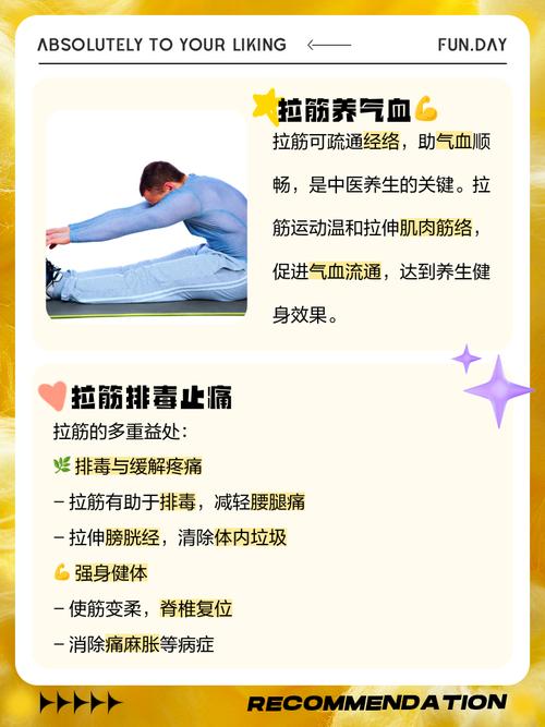方法:在拉完内三经后,再进行外三经的拉伸,每天持续三五分钟。好处:有助于提升行走的轻松感和灵活性。其他拉筋方法还包括:瑜伽式拉伸:通过各种瑜伽体式,如弓步式、三角式等,对全身筋络进行拉伸。好处:增强身体柔韧性,促进身心放松。