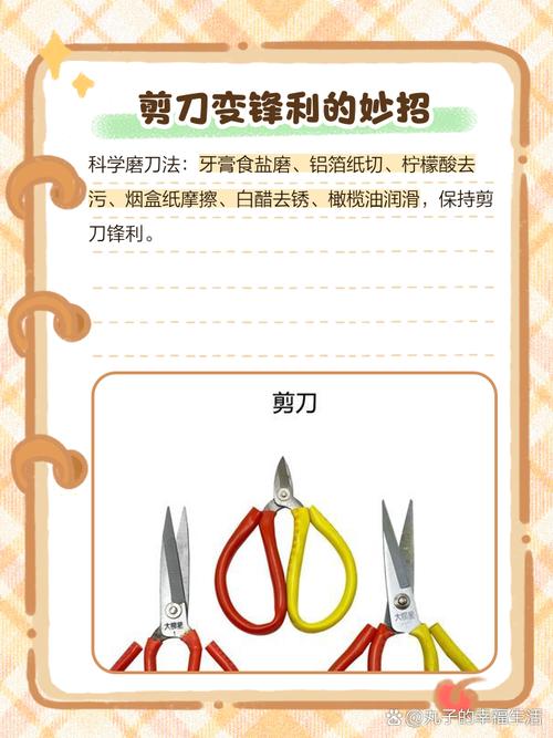 〖Two〗、当剪刀不锋利时,有多种方法能让其再度锋利。 使用磨刀石打磨:准备一块合适的磨刀石,将剪刀打开,刀刃与磨刀石呈一定角度(约20度),然后在磨刀石上来回均匀地摩擦,注意两面都要磨,且力度适中,磨几分钟后剪刀会逐渐锋利。 利用铝箔纸:取几张铝箔纸叠在一起,用剪刀反复裁剪铝箔纸。