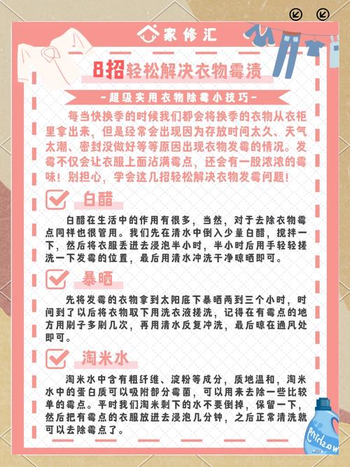〖One〗、阳光暴晒:步骤:将霉斑衣物放置在阳光下暴晒一段时间。作用:利用紫外线杀菌,减少霉斑的滋生。清除霉毛:步骤:使用刷子轻轻刷去衣物表面的霉毛。注意:避免用力过猛破坏衣物纤维。酒精溶液清洗:步骤:将酒精加入适量清水中,制成酒精溶液,用其清洗霉斑区域。作用:酒精具有杀菌作用,能有效去除霉斑。