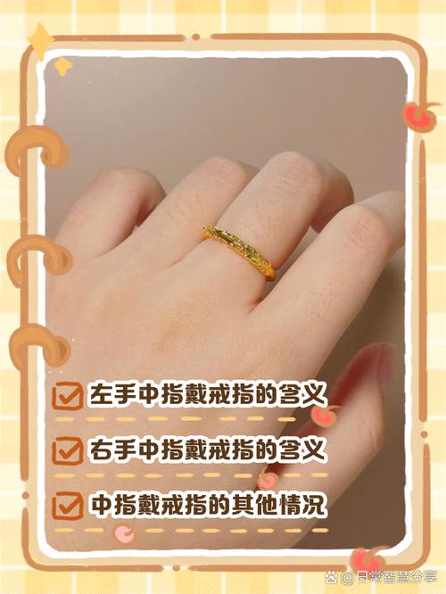 在中国的文化习俗中:左手中指戴金戒指:大多数情况下表示订婚状态,意味着佩戴者已经有稳定的伴侣并且双方已经达成婚姻的意向。右手中指戴金戒指:通常表示正在恋爱中或者心有所属,也可能表示准备结婚的状态。在西方文化及世界通行的习俗中:左手中指戴金戒指:普遍代表已订婚或处在非常稳定的恋爱关系中,即将步入婚姻殿堂。
