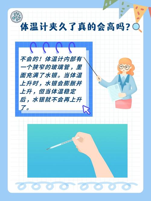 人体的正常体温范围是37到32摄氏度。体温计,特别是水银温度计,会在接触人体后迅速达到平衡状态,显示的温度不会超过水银球内部的温度。因此,无论你将体温表夹多久,温度显示都不会上升。人体的体温调节机制非常精密。当你使用体温计测量体温时,它会通过接触皮肤表面来获取温度读数。