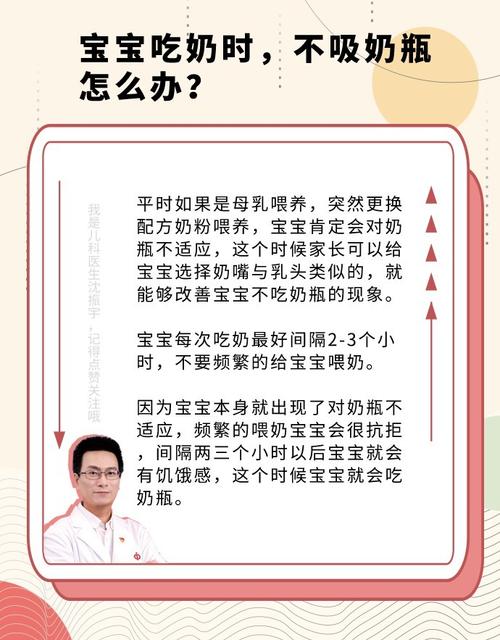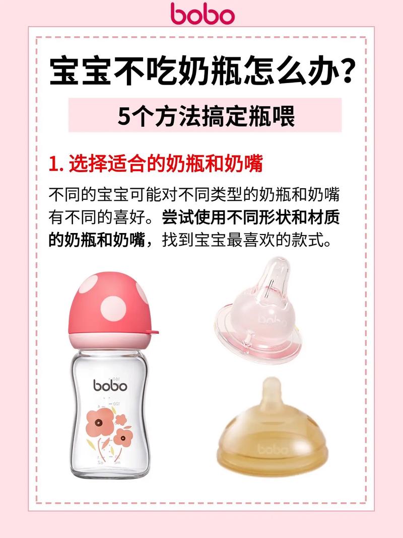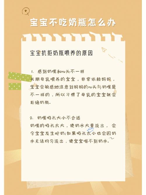 〖One〗、如果宝宝不吃奶瓶,可以尝试以下方法:逐渐转换:在宝宝最饿的时候尝试给他/她奶瓶,或者先让宝宝熟悉奶瓶的形状和质地。不同形状的奶嘴:有些宝宝可能对某种形状的奶嘴更感兴趣,可以尝试不同的形状。