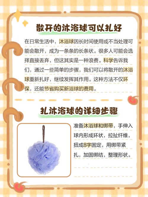 〖Three〗、如果浴球散开程度较严重,可以考虑使用绳子穿过浴球网面的内层,帮助固定浴球。选取结实耐用的绳子,如棉绳或鞋带等,确保绳子能够牢固地固定浴球。将绳子穿过浴球内部后,打结或系紧,确保浴球不会再次散开。废物利用法:如果浴球已经无法恢复,可以考虑废物利用。剪掉散掉的部分,将底边缝合,然后翻过来。