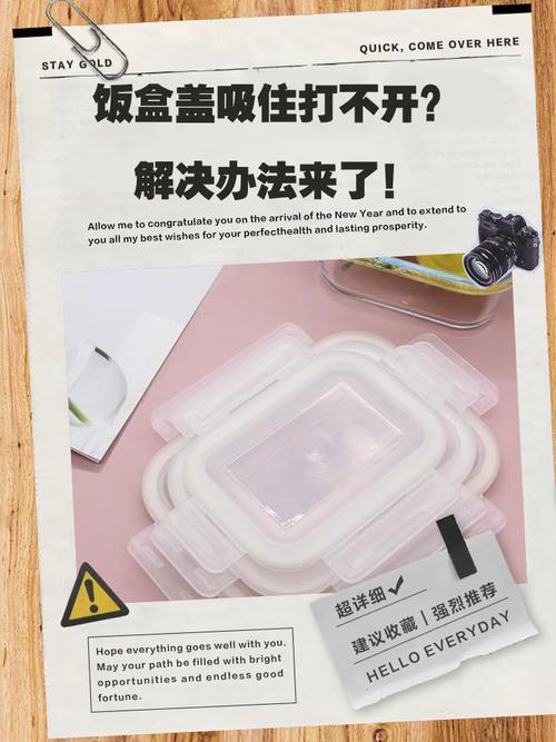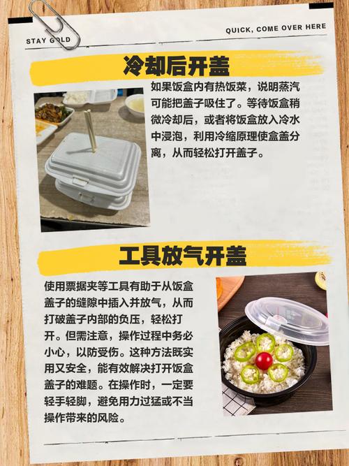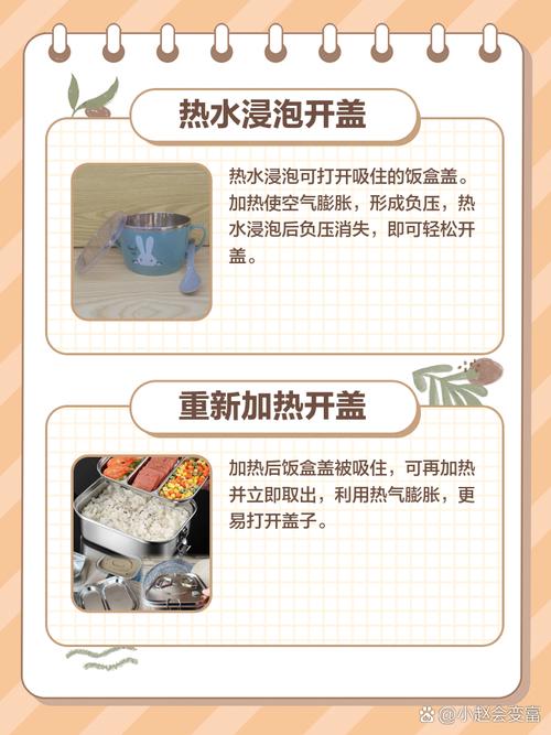 〖Four〗、饭盒盖子吸了开不下来的解决方法主要有以下几种:浸泡在热水中 将饭盒放入一个足够大的盆中,然后倒入沸水,确保沸水能够覆盖整个饭盒。让饭盒在热水中浸泡大约5分钟。这样做可以使饭盒内部的空气受热膨胀,从而增加饭盒内部的压力,使其与外界大气压相平衡。