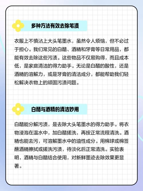 大头笔可以使用多种方法进行清洗。对于衣物上的大头笔污渍,首先可以尝试使用牛奶。将牛奶倒在污渍处,轻轻揉搓,然后用清水冲洗干净。牛奶中的蛋白质和脂肪有助于分解笔迹中的油性成分,从而达到清洁的效果。其次,酒精也是一个有效的清洁剂。将酒精涂抹在笔迹上,用干净的布轻轻擦拭,直至笔迹消失。