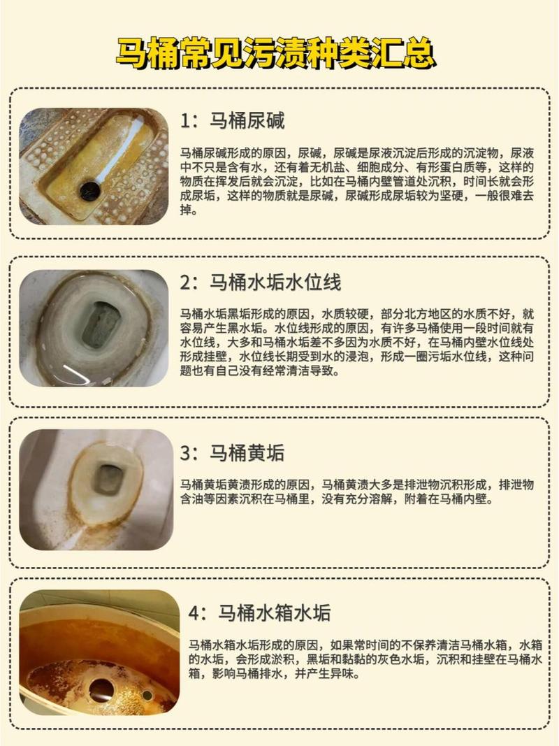由水垢和尿碱长期积累所致,成分主要是碱 【水垢】碳酸钙(CaCO3)、氢氧化镁(Mg(OH)2)【尿碱】主要成份是磷酸盐无机物及尿素、蛋白质有机物等 可用酸性物质去中和(白醋)。有盐酸,硫酸(强腐蚀)用时注意安全。