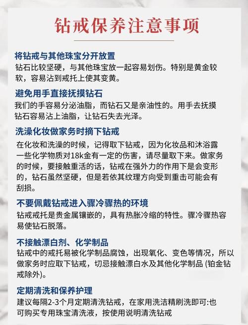 注意佩戴频率:钻戒的保养时间取决于佩戴次数。如果钻戒几乎不离身,建议每月保养一次;如果每天佩戴,建议每隔2~3个月进行保养与检查。如果钻戒不常佩戴,放在干燥的戒指盒内,则一年甚至几年才需保养。避免化学物质:钻戒应避免接触到化学物质,如香水、清洁剂、化妆品等,这些物质可能会对钻石造成损害。