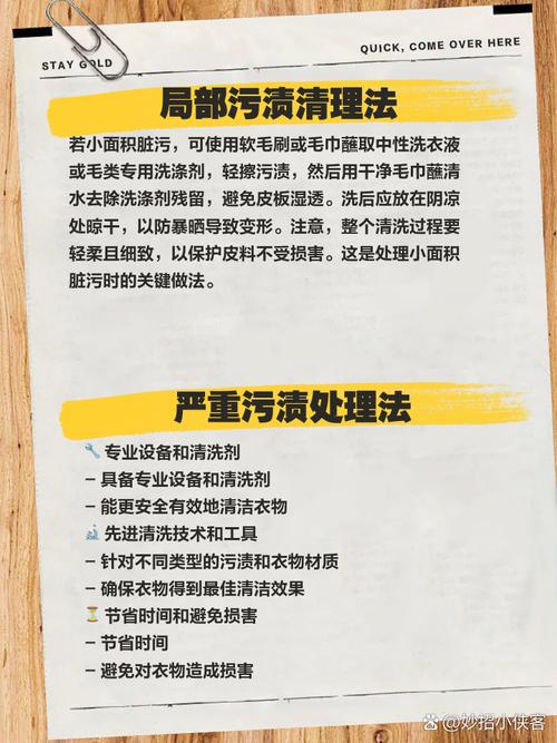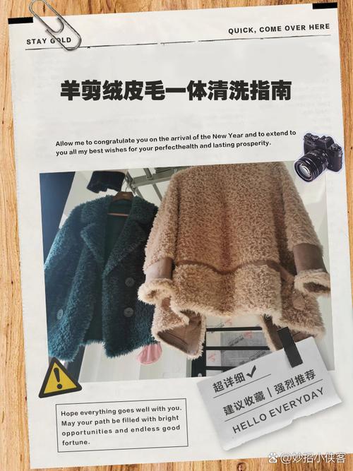 首先,准备好皮衣清洗剂、海绵、木梳和吹风机。这些工具将帮助你有效且安全地清洗羊剪绒皮毛一体的衣服。清洗皮毛 涂抹清洗剂:在海绵上挤出适量的皮衣清洗剂,然后顺着皮毛的方向轻轻擦拭,确保清洗剂均匀覆盖在皮毛表面。湿润处理:将一块干净的毛巾放入大约三十度的温水中,捞出后拧至半干状态。