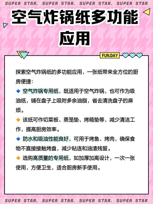 〖Three〗、- 非专用吸油纸需根据空气炸锅锅底裁剪适当大小,盛装食物并保持炸锅内壁清洁。- 专用吸油纸已裁好尺寸,可直接放入炸锅中使用。- 将吸油纸平铺在烤盘或炸篮里。- 根据食物烹饪时间和温度调整机器设置,等待食物熟透。