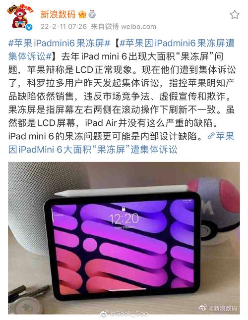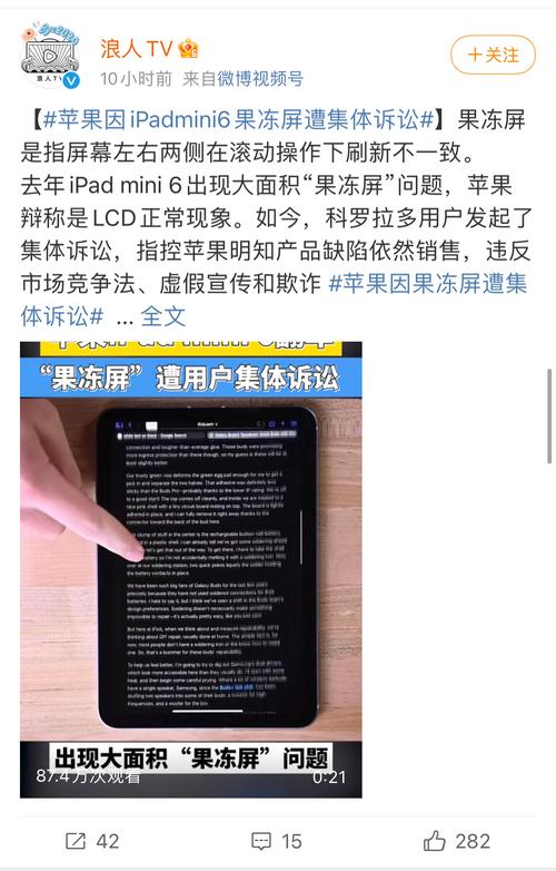 苹果iPad mini 6被曝果冻屏问题,消费者集体投诉近期,有消息传出,苹果新款iPad mini 6遭遇到果冻屏的困扰,引发了消费者的强烈不满。投诉者指控苹果存在虚假宣传和欺诈行为,质疑其产品可能存在质量问题。