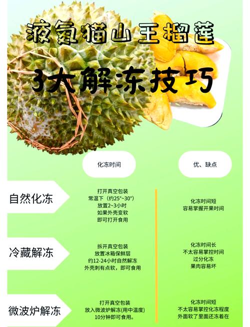 〖Two〗、这种方式能最大程度保留榴莲的口感和营养,一般需5 - 8小时,解冻后的榴莲肉软糯香甜,和新鲜的差不多。常温解冻法将榴莲肉从冷冻室取出,放在常温环境下解冻。时间大概1 - 两小时,不过要注意观察解冻情况,避免解冻过度,影响口感。冷水解冻法把榴莲肉装在密封袋里,放入冷水中。