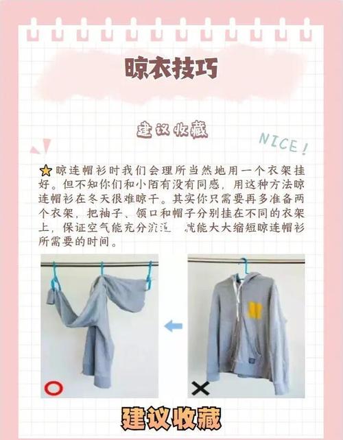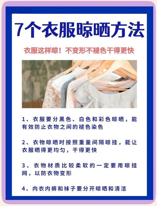 〖Four〗、晾衣服时为避免皱褶,可以采取以下小技巧:采用正确的晾晒方式 自然悬挂:将衣物自然悬挂晾晒,避免过度拉伸,这样可以有效防止衣物变形和产生皱褶。选取合适的正反面晾晒 外衣反晒:外衣建议反着晾晒,以减少太阳直射导致的褪色。