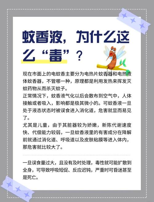 〖Two〗、电蚊香液是一种方便、有效、安全的驱蚊产品,正确使用电蚊香液可以有效地预防蚊虫叮咬。以下是电蚊香液的正确使用方法: 购买正规渠道的电蚊香液 在购买电蚊香液时,要选取正规的品牌和渠道,确保产品质量和安全。 使用前检查电蚊香液的包装和说明书 确保电蚊香液的包装完好无损,没有漏液现象。
