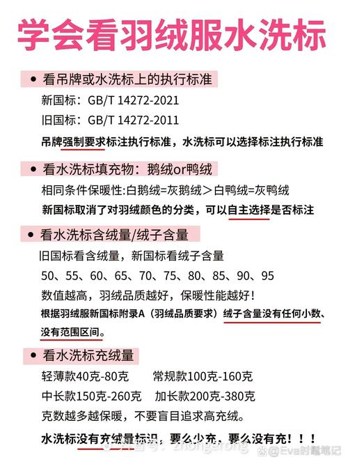 〖Two〗、要想看懂新国标羽绒服吊牌,可从以下几方面入手。关注填充物。吊牌会标明填充的是鸭绒、鹅绒等,鹅绒通常保暖性更佳。同时会标注含绒量,新国标规定羽绒服含绒量应不低于50%,越高保暖性越好;还有充绒量,充绒量越高越暖和,不过也与衣服尺码、款式有关。查看蓬松度。