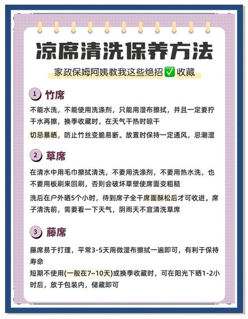 〖Five〗、麻将凉席:针对麻将凉席,可以使用醋与盐调制的温水进行清洗,这种方法能有效杀菌,同时不会对席子造成损害。 湿毛巾擦拭 藤席:清洗藤席时,应将藤席摊开,用湿毛巾把藤席表面擦干净。注意不能用水冲刷,也不能使用化学药剂,以免损坏席子。清洗干净后,应放在阴凉处晾干,避免曝晒。