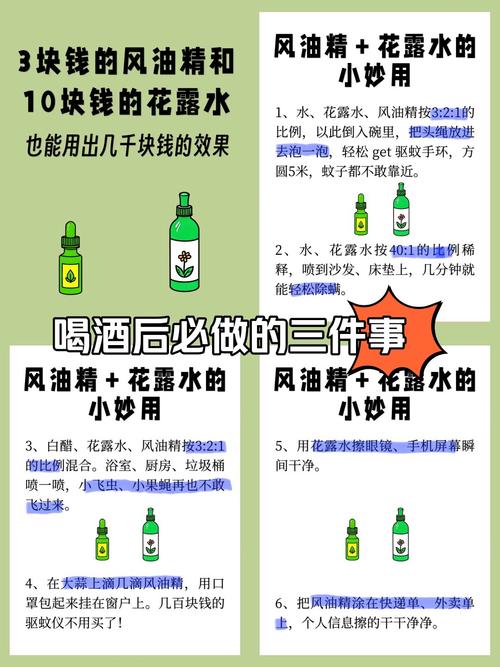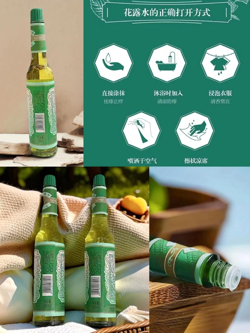 〖Four〗、驱蚊花露水可搭配风油精、白醋、精油、驱蚊手油、驱蚊香或酒精使用,以增强驱蚊效果,具体搭配方式及原理如下: 风油精将驱蚊花露水与风油精按1:1比例混合后,喷洒于皮肤或衣物表面。