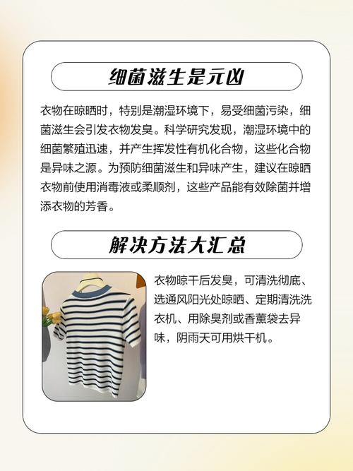 〖Two〗、衣服晾干后有馊味的原因主要是因为没有洗干净或晾晒环境潮湿导致衣服中的水分没有挥发干净。未洗净的残留物 衣服在清洗过程中,如果洗涤剂或污渍没有完全冲洗干净,这些残留物在潮湿环境中容易滋生细菌,进而产生异味。尤其是汗液、皮脂等人体分泌物,以及食物残渣等,都是细菌滋生的温床。