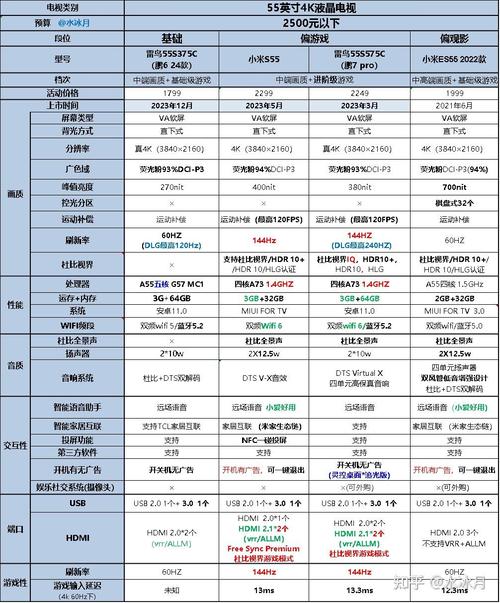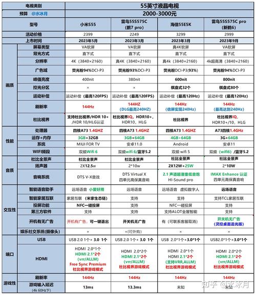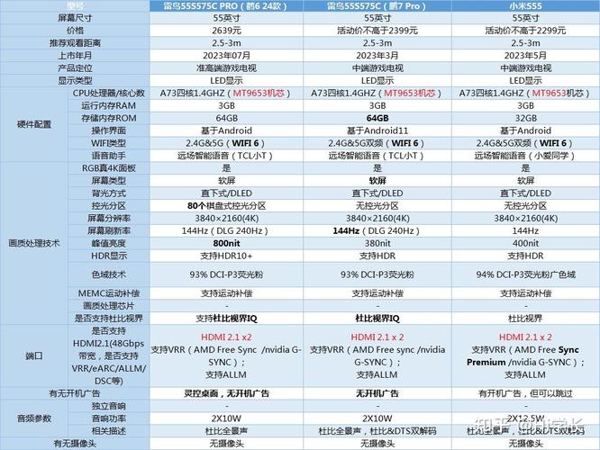 〖Two〗、创维 55A5D Pro 性能强大,8GHz处理器,144Hz高刷屏和丰富的端口,适合对游戏体验和音响效果有追求的用户。 雷鸟 55S585C Pro Mini LED电视,1300尼特亮度,384个控光分区,适合对画质和音效有高端需求的用户,费用上高于雷鸟 55S575C。