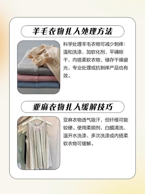 使用柔软剂浸泡:如果是因为面料静电或纤维过硬导致的扎人感,可以尝试使用柔软剂浸泡衣物20分钟,然后取出晾干,以减少静电并增加面料的柔软度。彻底清洁:检查衣物上是否有难以察觉的小异物,如小虫子或细线等,这些也可能导致穿着时产生扎人的感觉。通过彻底清洁可以去除这些异物,从而消除扎人感。