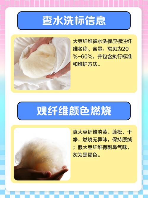 鉴别大豆纤维被的含量可通过以下方法: 查看水洗标正品大豆纤维被的水洗标必须标注国家标准名称,如“聚乙烯醇纤维(含蛋白)”或“大豆蛋白复合纤维”,并明确标明成分比例(如“60%聚乙烯醇纤维+40%聚酯纤维”)。