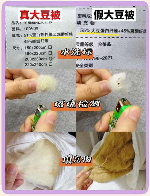 被子上标注的大豆纤维,如何鉴别真伪?一种简单的方法是通过燃烧辨别。燃烧大豆纤维时,会散发出类似烧黄豆的气味,燃烧后易成粉末状。这有助于区分是否为大豆纤维。另一个方法是检查被子上的大豆纤维含量。正规的大豆纤维被子,其含量通常不低于50%。