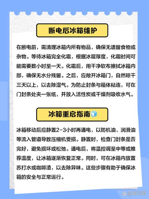 〖One〗、如果停电时间在4小时以内,冰箱内的食物仍然可以安全食用,前提是停电期间必须确保冰箱门紧闭。 如果停电超过4小时,冷冻室如果处于饱和状态,食物可以安全保存48小时;如果半满状态,保存时间缩短至24小时。 为了减少停电对冰箱的影响,可以采取以下措施:- 平时可以在冷冻室预先放置一些小塑料袋装的清水,冻成冰块。