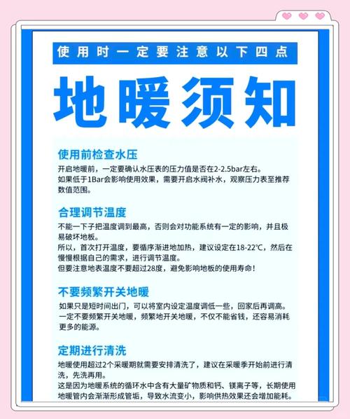 〖Five〗、对于长时间不使用的房间,比如连续几天甚至更长时间无人,可以考虑关闭地暖。但对于仅几个小时或特定时间段不使用的房间,建议不要关闭,调低温度即可。因为地暖是低温运行系统,关闭再重新打开会导致能耗增加。初次使用地暖的注意事项 首次使用地暖时,应缓慢升温。