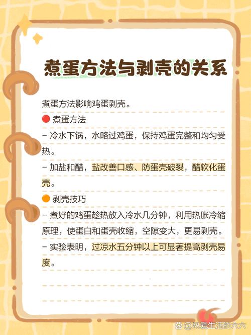 〖Six〗、煮鸡蛋不裂壳的方法主要有以下几种:冷水浸泡法:方法:在煮鸡蛋之前,先将鸡蛋放入冷水中浸泡一段时间。原理:冷水浸泡可以使鸡蛋内部的温度逐渐上升,与外壳的温度保持一致,从而减少在加热过程中由于温度差异导致的蛋壳破裂。扎孔法:方法:在煮鸡蛋之前,使用细针在鸡蛋的底部扎一个小洞。